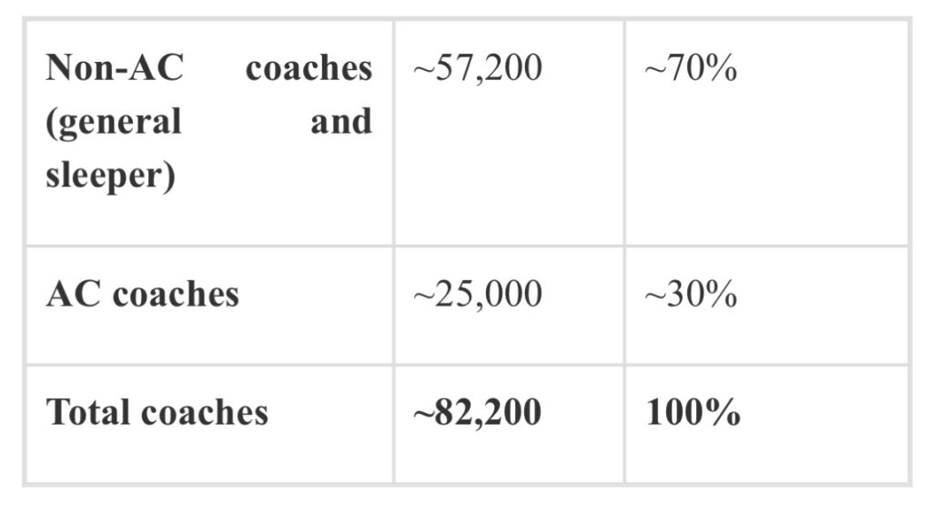 The percentage of non-AC coaches has significantly increased to about 70% as detailed below: