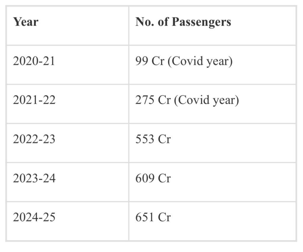 Due to higher availability of general coaches, the number of passengers traveling in general/ unreserved coaches has shown an increasing trend as shown below: