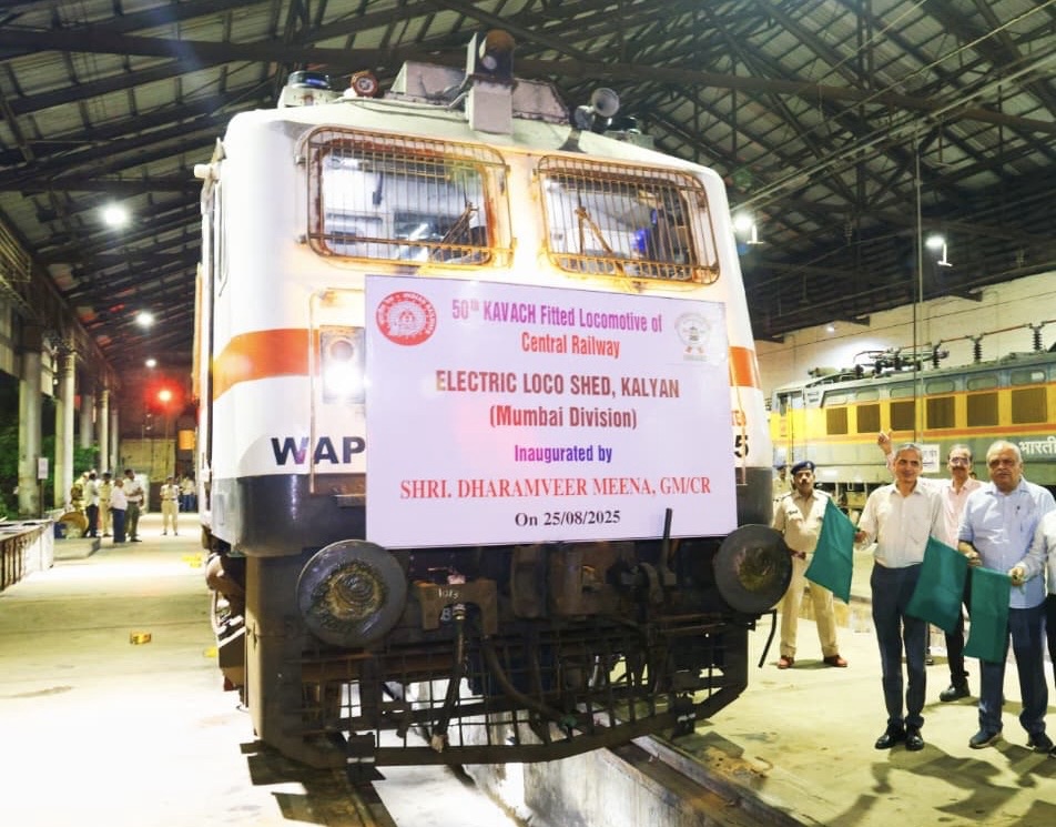 Mumbai: #CentralRailway achieved another milestone in enhancing rail safety with the fitment of the KAVACH system on its 50th locomotive (WAP-7/37335) at Electric Loco Shed, Kalyan. The locomotive was flagged off by Dharam Veer Meena, General Manager, Central Railway, in the presence of Hiresh Meena, Divisional Railway Manager, Mumbai Division, Principal Chief Electrical Engineer, and Principal Chief Signal & Telecommunication Engineer and other Senior Officials of Central Railway.