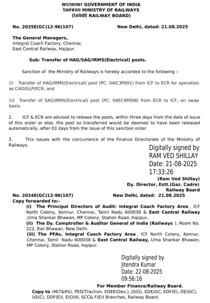 On 21 August, 2025, #RailwayBoard issued a mysterious order. It sought to transfer a #HAG and one #SAG element of #Electrical cadre between East Central Railway (#ECR) and Integral Coach Factory (#ICF). This is something which is considered routine and straight forward. Except for two serious issues which are subject matter of this article: