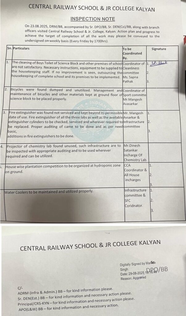 सेंट्रल रेलवे स्कूल कल्याण की हेड मिस्ट्रेस ने डीआरएम के निरीक्षण नोट को फैब्रिकेट किया?