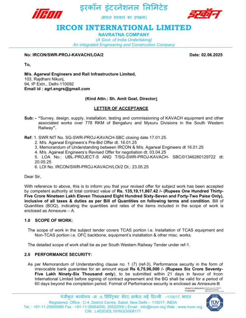 PCSTE/SWR awarded the tender to IRCON, without proper negotiations, through LOA no. UBL-PROJECT-S AND T/ SG-SWR-PROJ-KAVACH-SBC/01346260129722 dt. 20.05.2025 at very HIGH cost of ₹253.56 Crores as against Railway’s estimated cost of ₹191.82 Crore which is ₹64 crores higher than the #SWR’s estimated cost.
