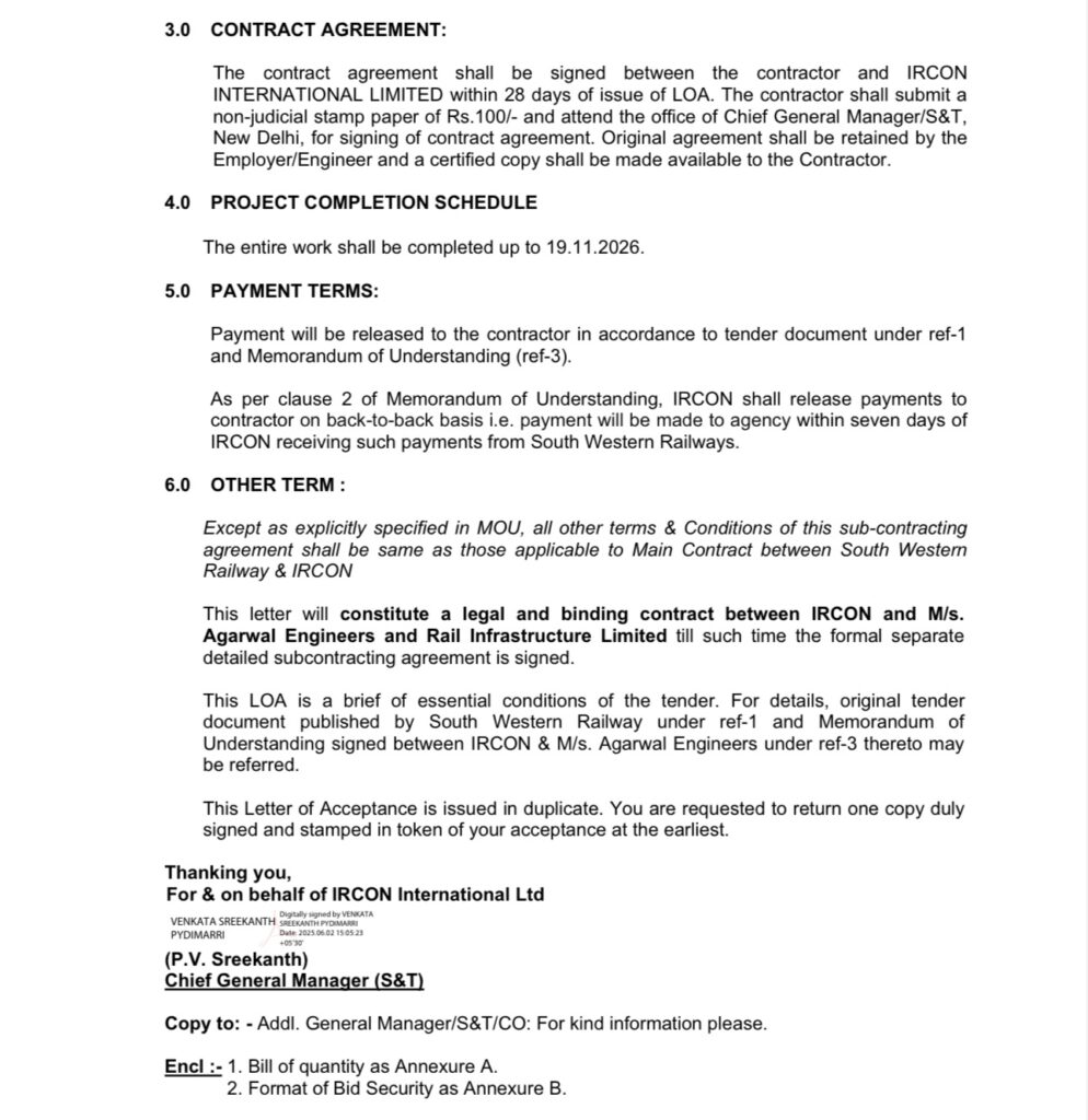 CGM-S&T-IRCON took revised offer on 03.04.2025 from M/s Agarwal Engineers and Rail Infrastructure Limited.