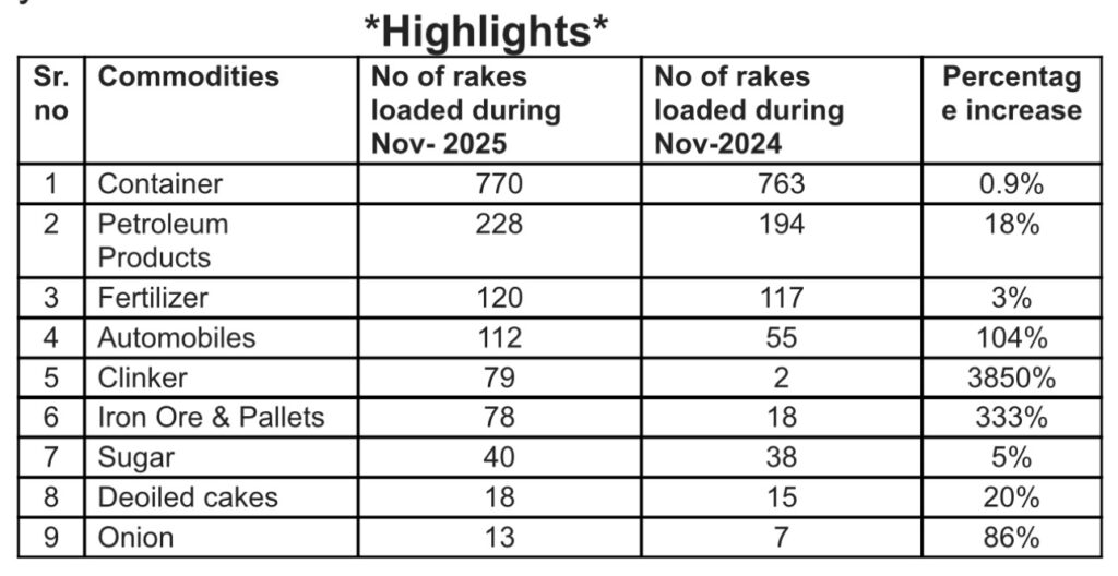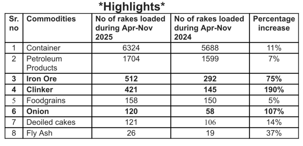 Financial Year-2025-26 (April to November-2025) – 50.12 million tonnes loaded. Onion, Iron Ore & Clinker have dominated the loading figures for the FY 2025-26