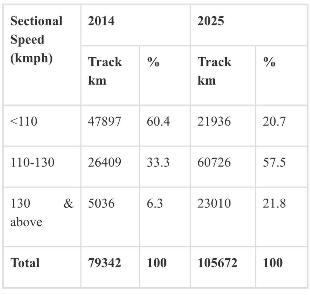 As a result of the above measures, there has been significant increase in speed potential of the tracks. Total percentage of track having speed potential of 110 kmph and above has gone to 79% in Nov’25 from 40% in Mar’14.