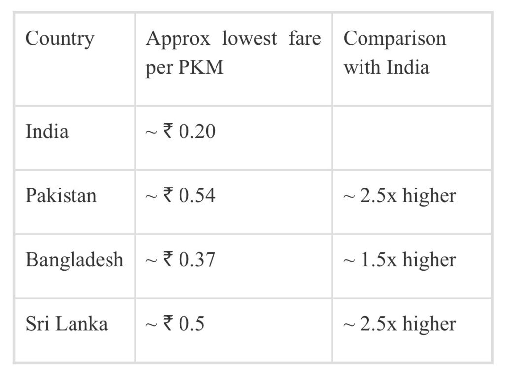 A comparison of the Indian Railway passenger fares (ordinary class) with the fares of the similar segment of services of the neighbouring countries is as under: