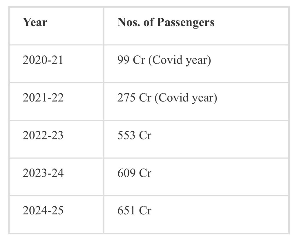 Overall, the passenger patronage of Indian Railways is showing steady and rapid growth trend, with consistent increase recorded during as under: