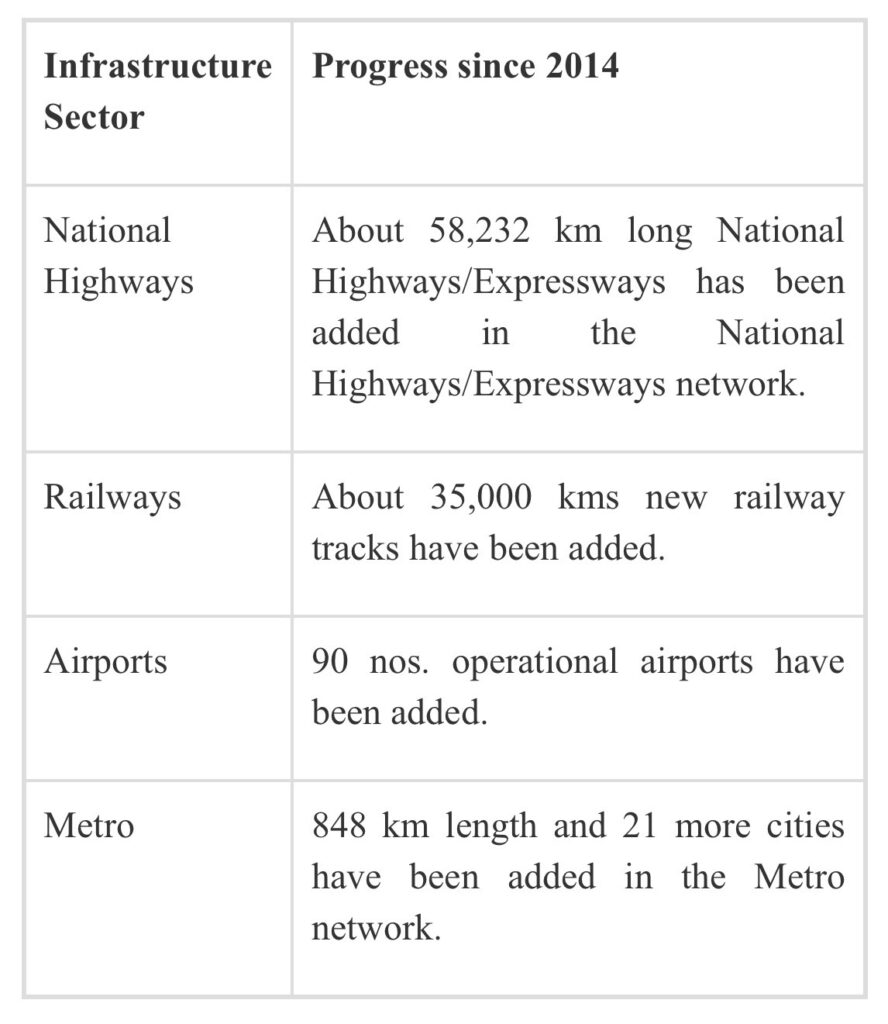Delhi (PIB): During last 11 years (2014-2025), unprecedented infrastructure creation/augmentation works have been carried out in all transport sectors in the country. Progress achieved during this period under the key infrastructure sectors are as under: