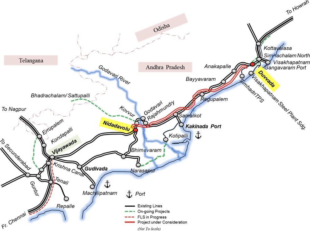 - Rajahmundry (Nidadavolu) – Visakhapatnam (Duvvada) section forms part of the Howrah – Chennai High Density Network (HDN).